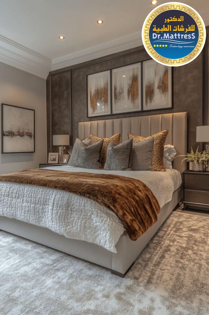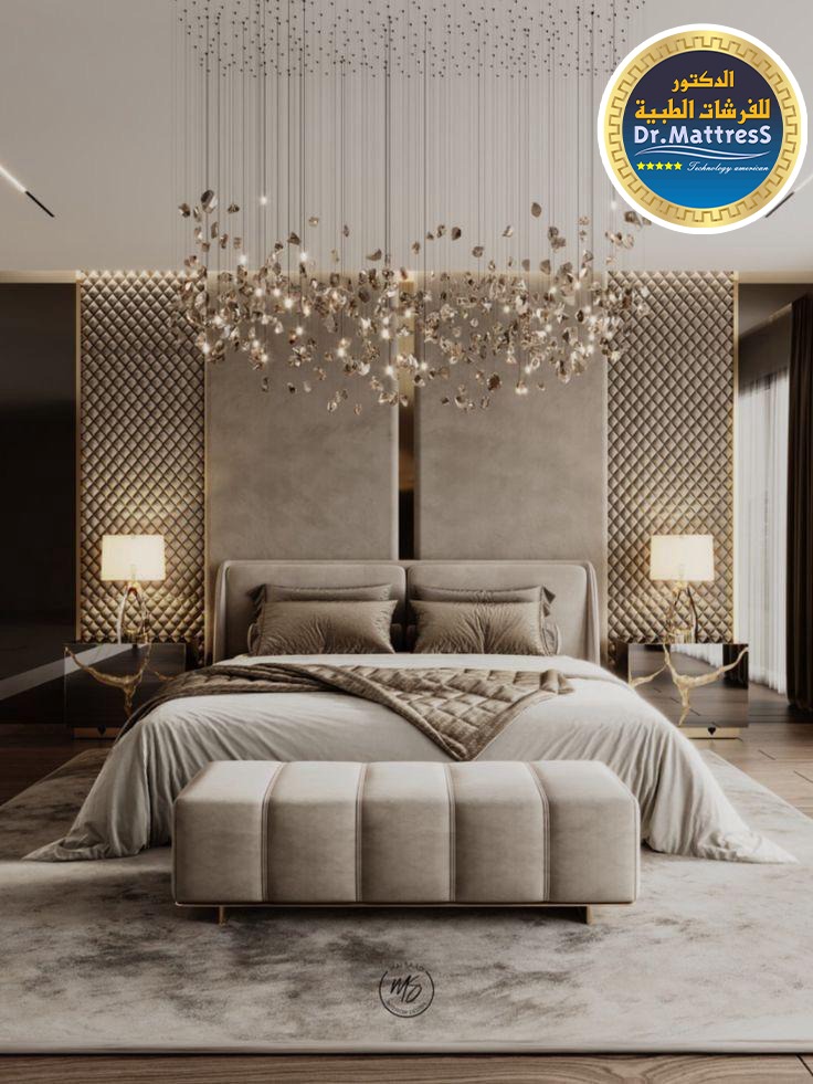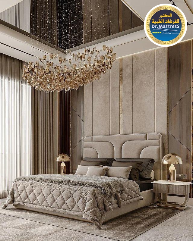 غرفة نوم تجمع بين الفخامة والهدوء بتصميم عصري راق يبعث على الراحة والاسترخاء ألوان متناسقة وناعمة تعكس احساس الدفء مع اضاءة هادئة تخلق اجواء مثالية